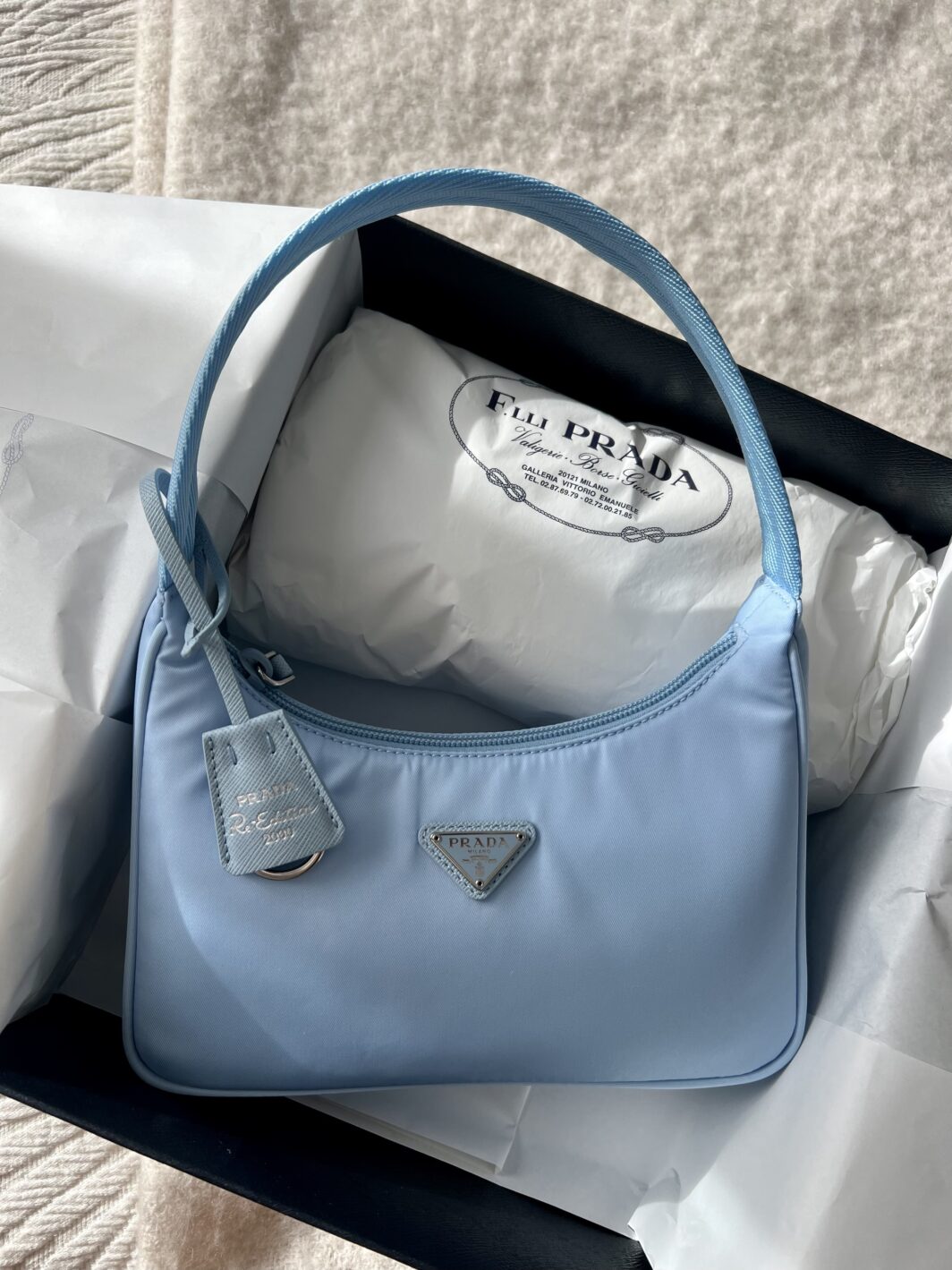 La borsa Prada re-Edition come gli amati modelli 2000 – 2005 , rivivono oggi attraverso l’uso sapiente della tela , un materiale che unisce leggerezza e resistenza a un’estetica raffinata, materiale di alta qualità , chiusura a zip logo a triangolo in metallo smaltato manico in nastro interno in re-nylon siglato colore azzurro altezza 17 cm larghezza 22cm lunghezza 6cm completa di dust pari al nuovo